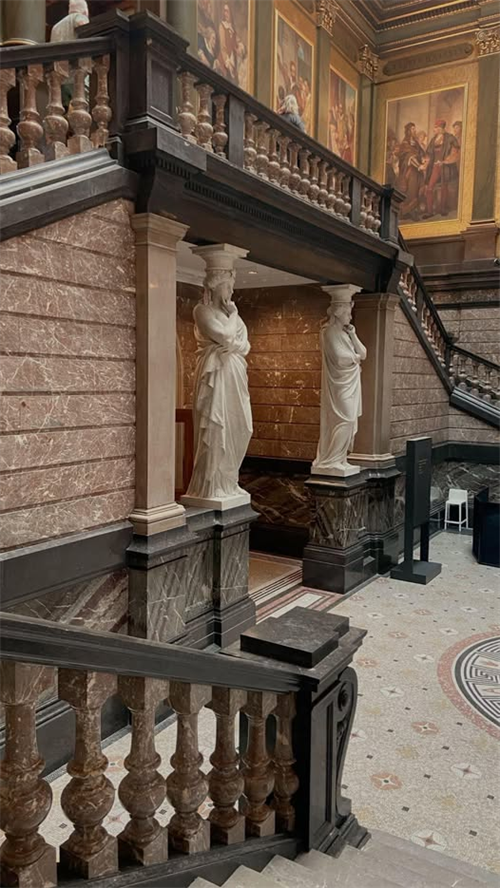 আর্কিটেকচার - দেয়ালগুলি স্ট্রাইকিং শিরাগুলির সাথে লালচে -বাদামী মার্বেলে আবৃত।